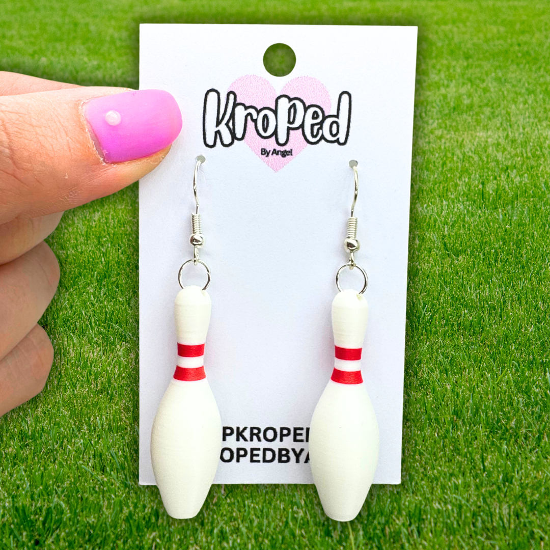 Strike up some fun with these adorable bowling pin earrings! Designed to look like classic bowling pins—complete with crisp white detail and that signature red stripe—these 3D printed earrings are the perfect mix of sporty and playful.