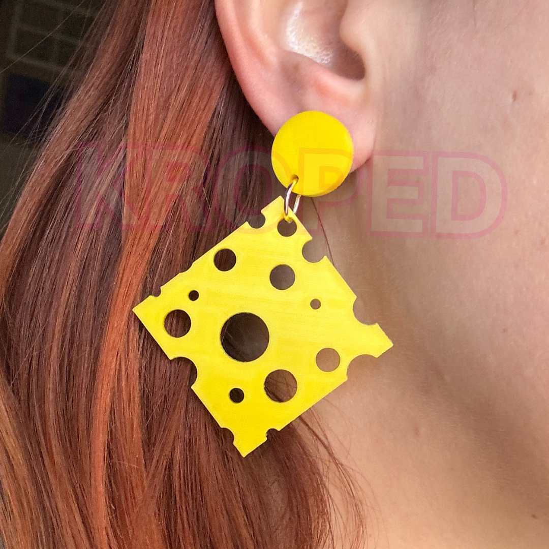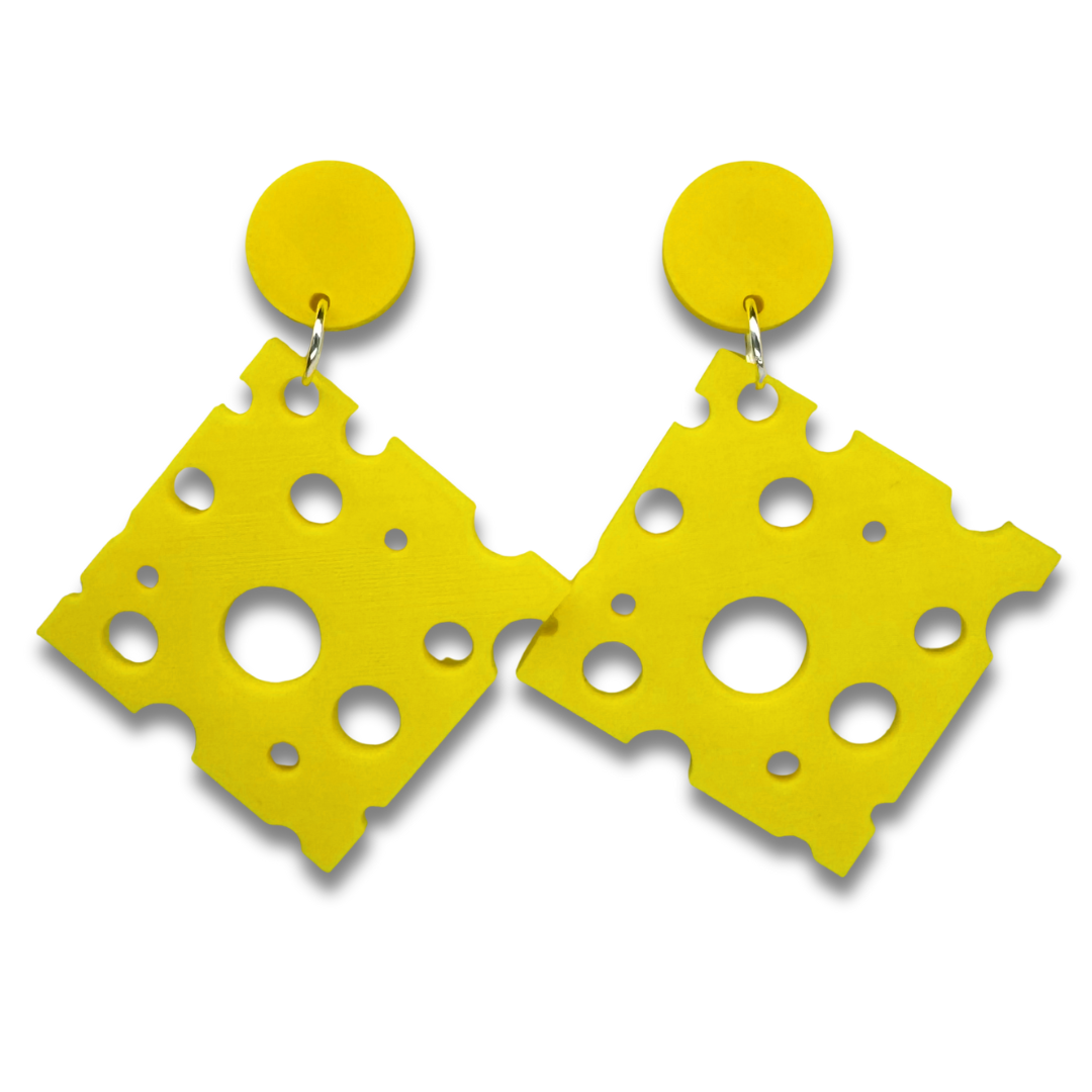 Say cheese! These playful 3D printed dangle earrings are designed to look like slices of Swiss-style cheese, complete with cut-out holes for a fun and quirky vibe. Bold and bright in yellow, they’re the perfect statement piece for foodies, cheese lovers, or anyone who enjoys a lighthearted accessory. Each pair is finished with sterling silver studs for comfort and durability, making them as wearable as they are eye-catching. Add some cheesy charm to your jewelry collection with this unique handmade pair!