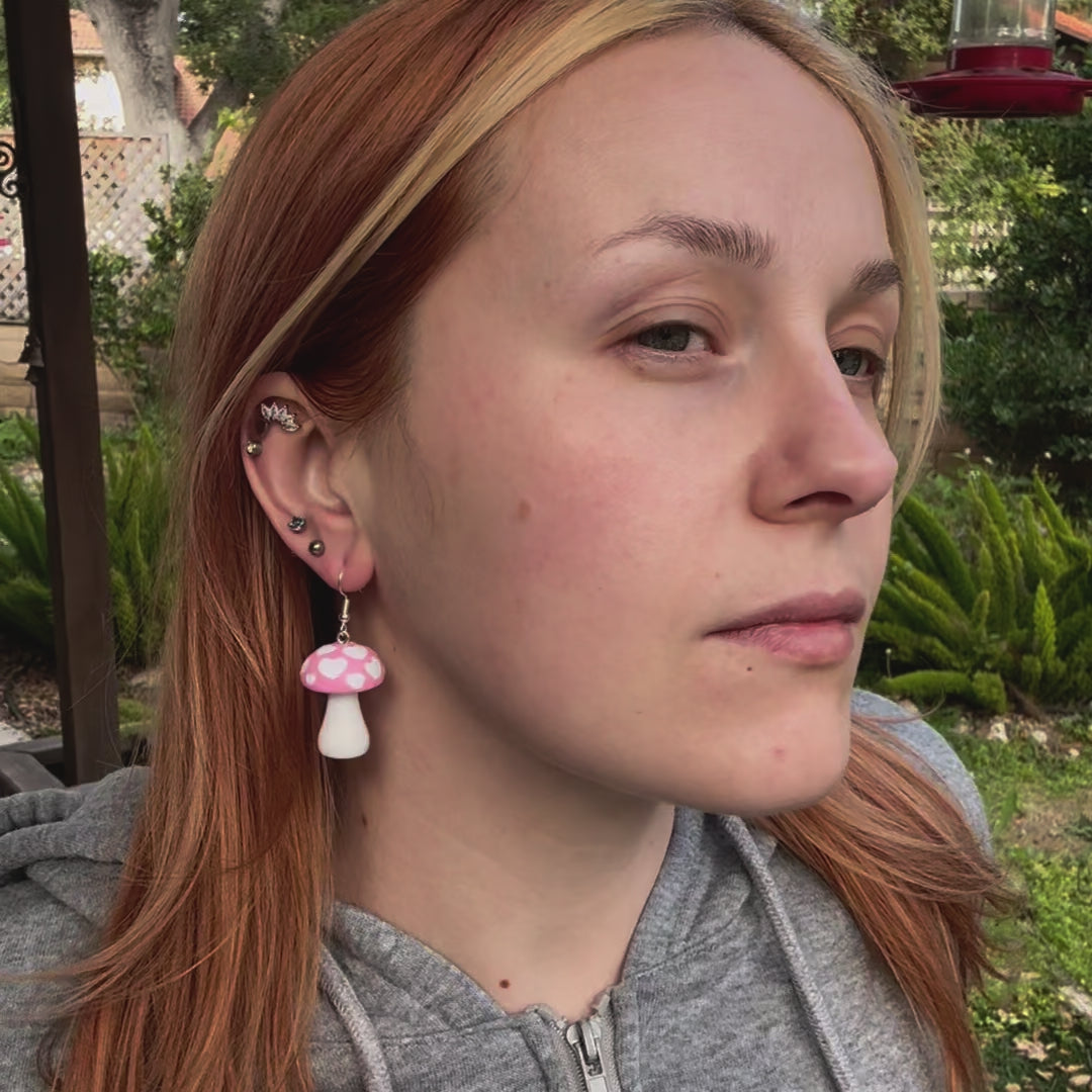 Pink and White Heart Mushroom Earrings