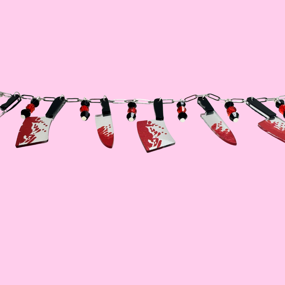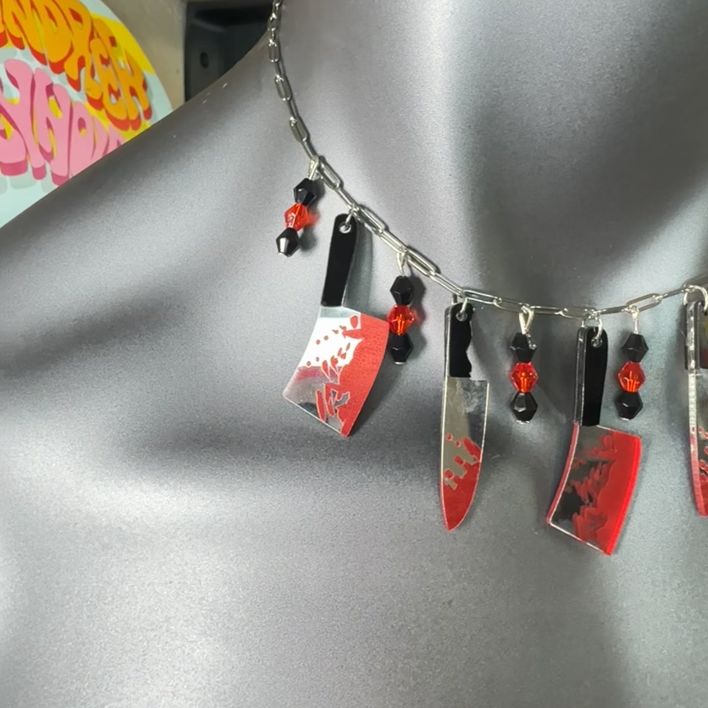 This unique Halloween-themed handmade necklace features a striking string of acrylic knives and butcher knives, elegantly displayed with black beads inbetween. Perfect for adding a touch of spooky flair to your costume or everyday attire, this eye-catching accessory is both playful and stylish, making it an ideal choice for Halloween enthusiasts and fashion-forward individuals alike. The 18" sterling silver chain ensures a comfortable fit, while the lobster clasp on the back provides secure closure.
