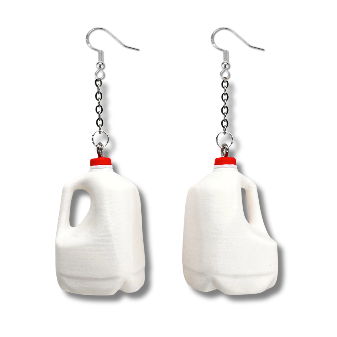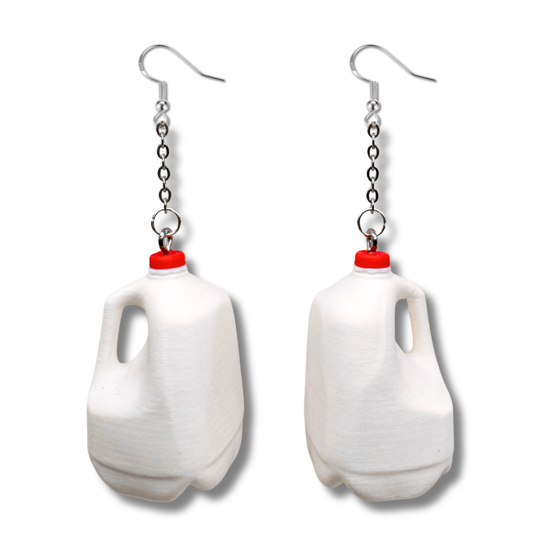 Got milk? These quirky 3D printed milk jug earrings are the ultimate statement piece for anyone who loves playful, out-of-the-box jewelry. Each earring is crafted to look just like a tiny gallon jug, complete with a bold red cap, and finished with a chain drop for extra swing. Lightweight, durable, and guaranteed to spark conversations, these earrings make the perfect gift for dairy lovers, nostalgia fans, or anyone with a bold sense of style.