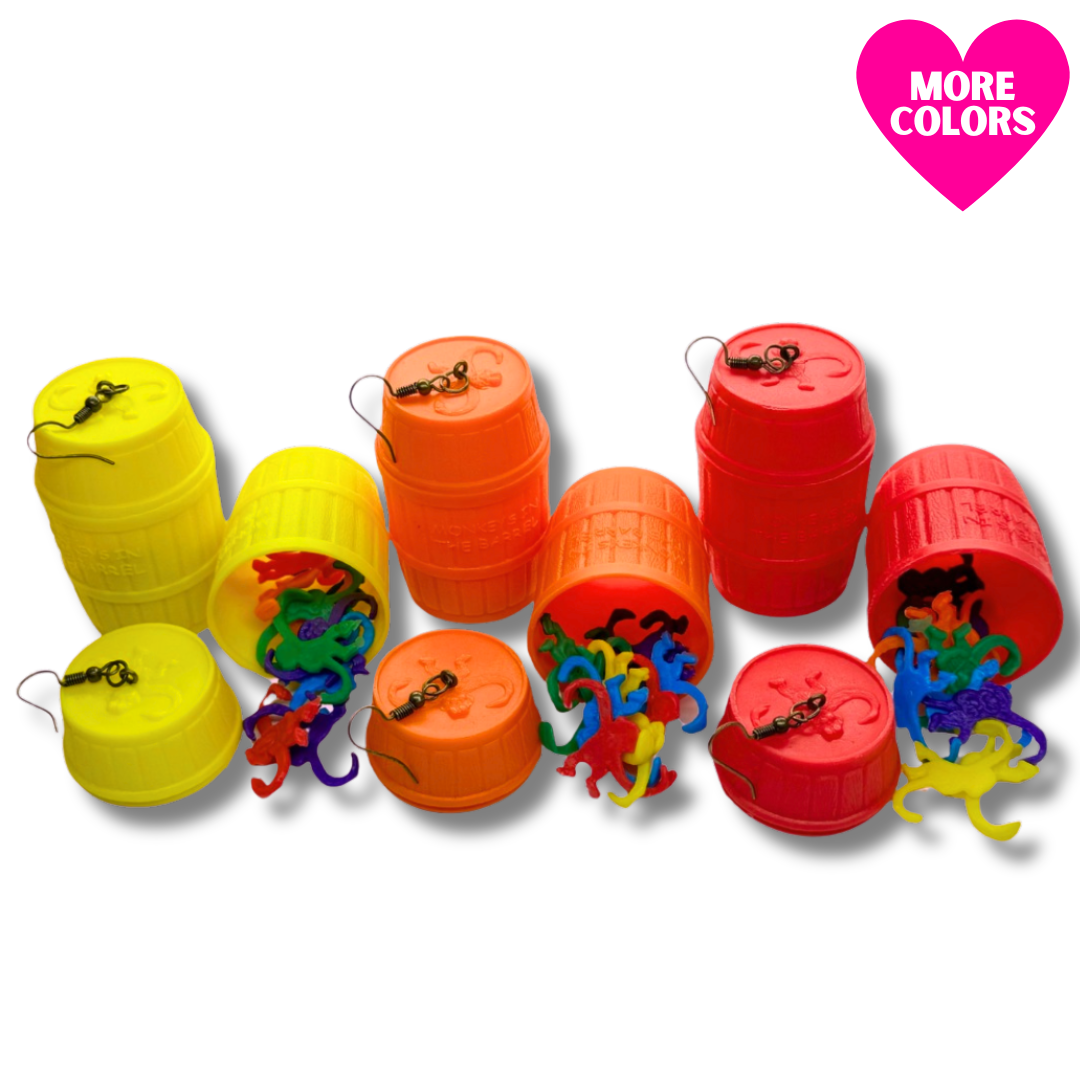 Each pair of earrings comes with a set of 20 adorable monkeys in assorted colors, ready to swing and play inside their colorful barrels. With 6 vibrant barrel colors to choose from, you can easily find the perfect match for your personal style. Whether you prefer a classic orange barrel or a vibrant green one, these earrings are sure to catch everyone's attention.