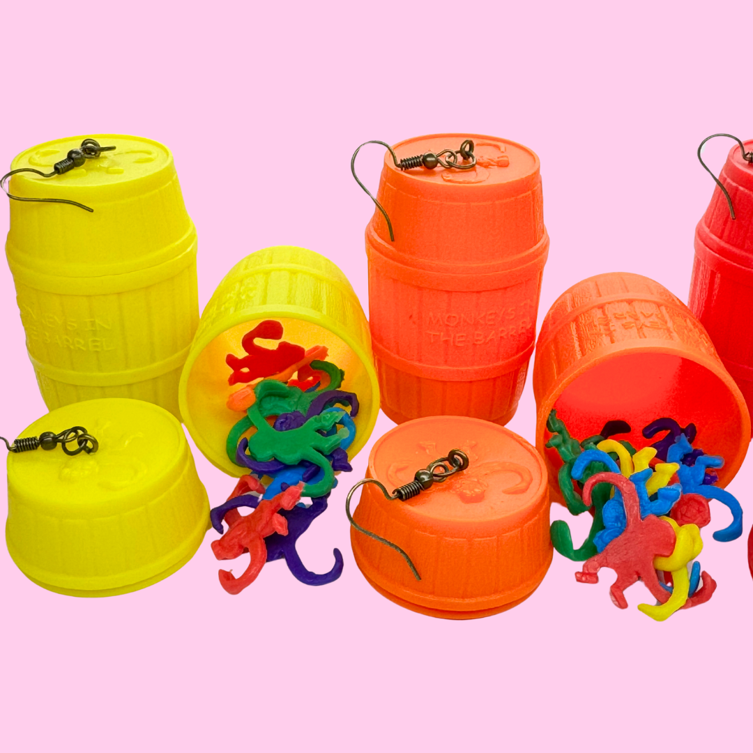 If you're looking to make a bold fashion statement and stand out from the crowd, these earrings are the perfect choice for you. Hand crafted with attention to detail, these earrings feature the iconic monkey in a barrel game, adding a touch of whimsy and nostalgia to your style.