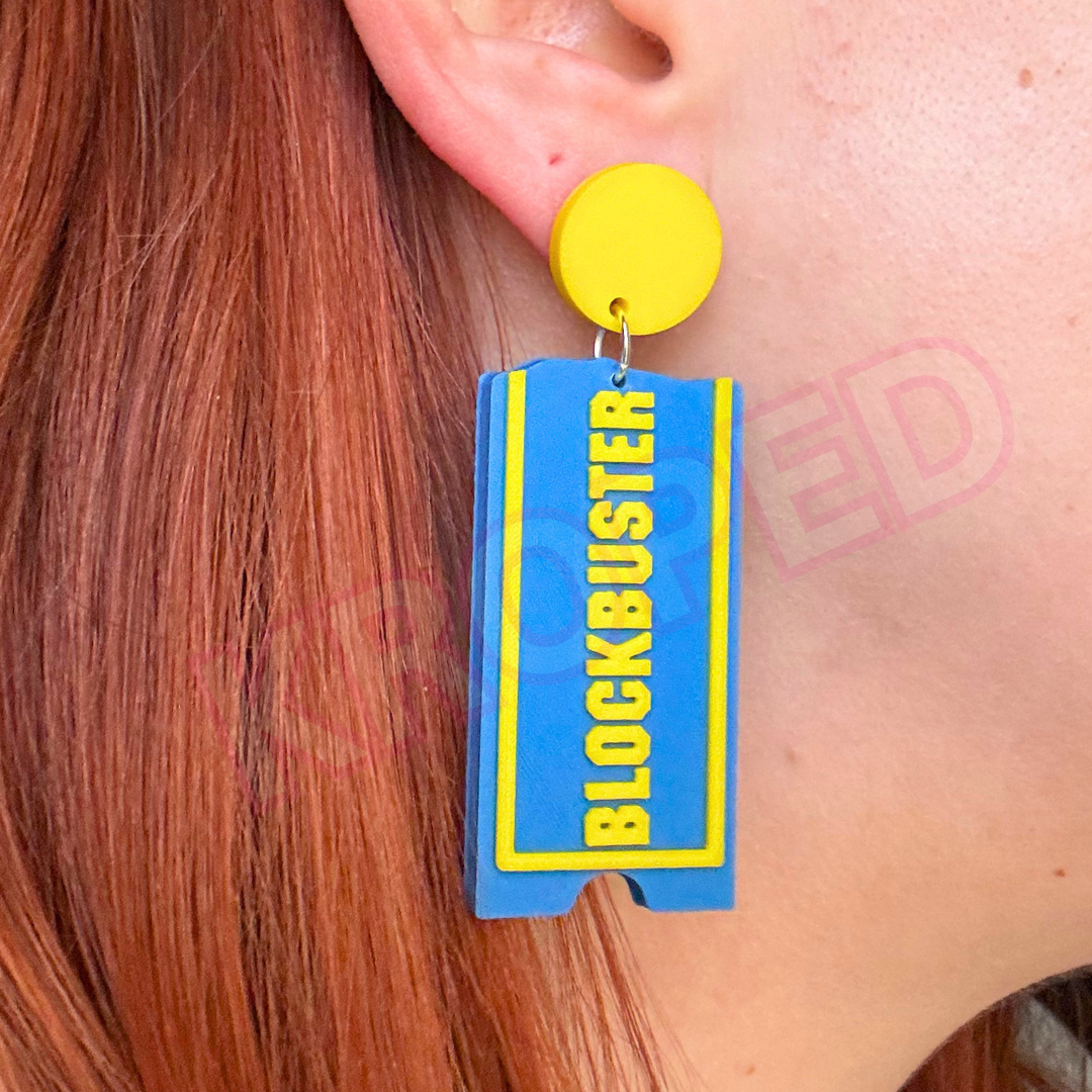 Bring back the nostalgia of Friday night movie runs with these retro-inspired 3D printed earrings! Shaped like the classic blue-and-yellow rental tickets from the 90s and early 2000s, these earrings are a fun throwback to simpler times of browsing aisles and picking the perfect film. Each pair is lightweight, bold, and finished with sterling silver stud backs for comfort and durability. Perfect for movie lovers, 90s kids, or anyone who loves a good dose of vintage flair.