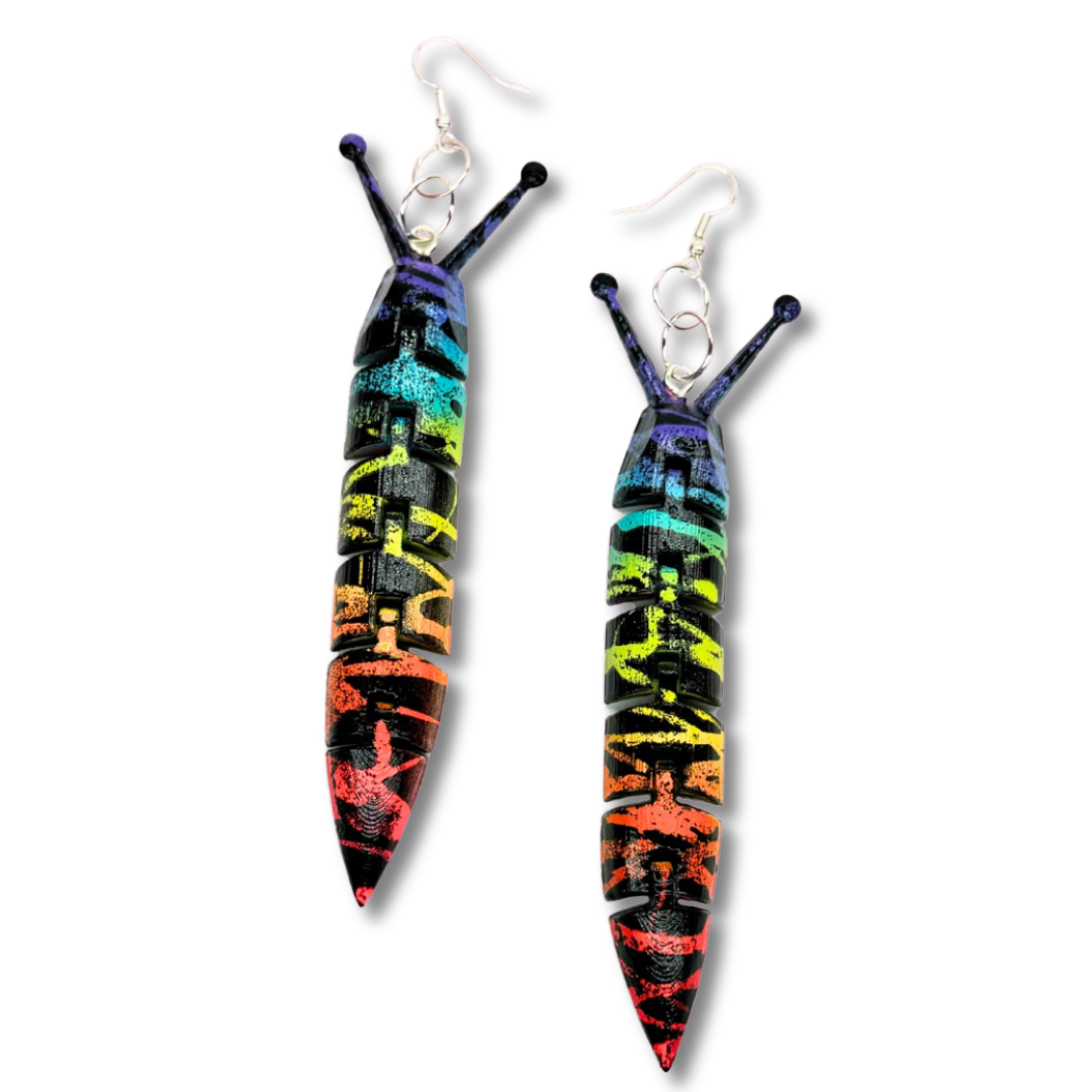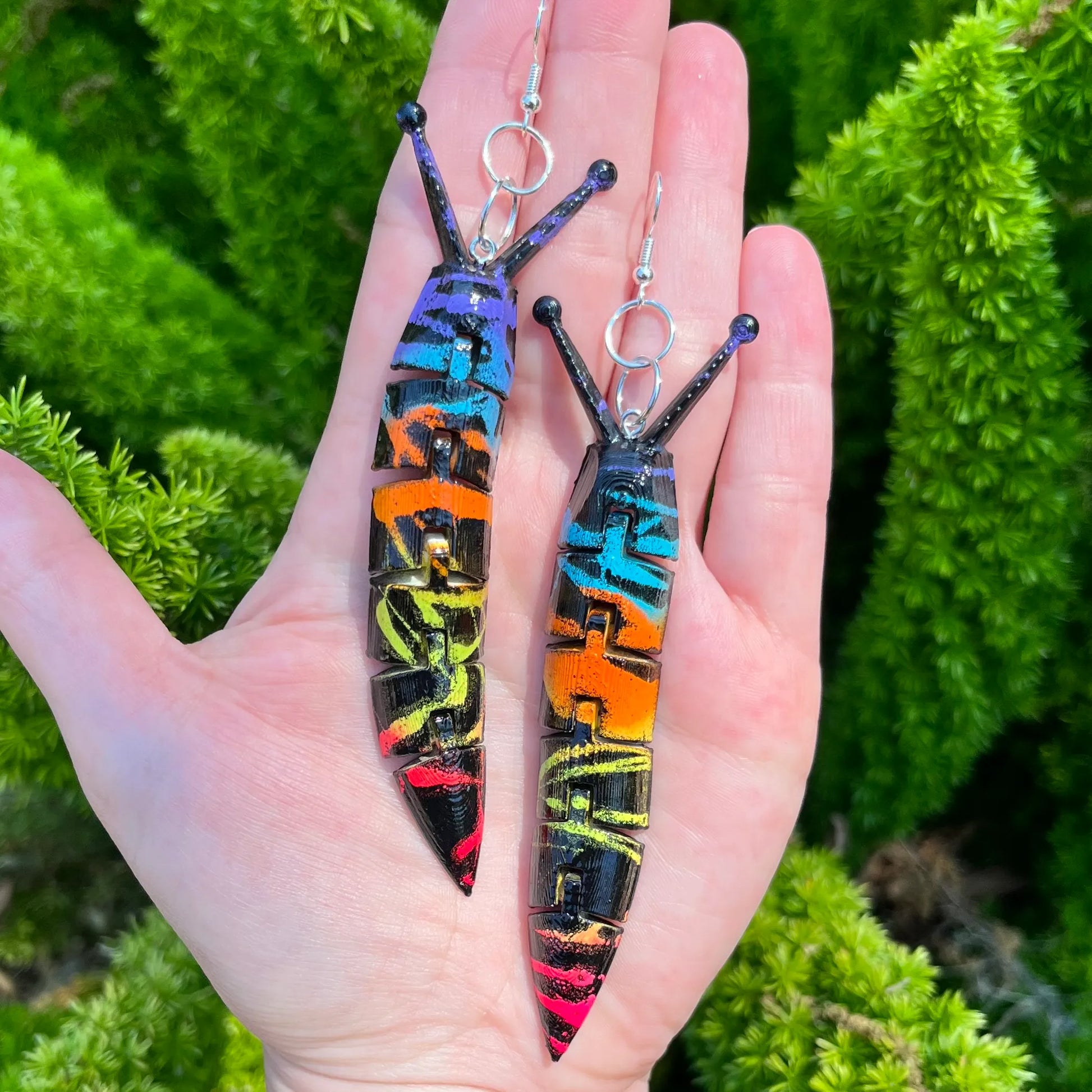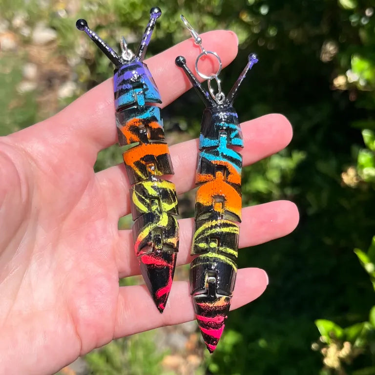 Each pair of slugs is 3D printed and then hand-painted with a one-of-a-kind graffiti pattern, ensuring that no two pairs are alike. Made from lightweight plastic, these slugs are surprisingly light and move along with your every motion, making them ideal for fidgeters. With their vibrant rainbow colors and playful design, these earrings are sure to add a touch of whimsy and individuality to any outfit. Get ready to turn heads and showcase your unique style with our Rainbow Articulated Slugs Earrings!