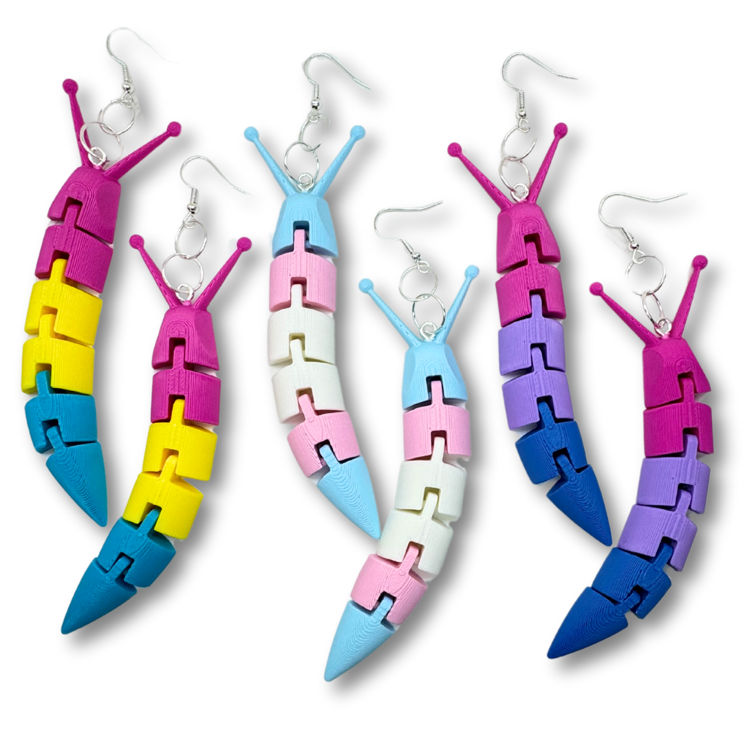 Celebrate pride and playfulness with these 3D printed slug earrings that wiggle as you move! Each pair is inspired by LGBTQ+ pride flags and features jointed segments for an adorable, flexible design that’s full of character. Choose from a variety of preset flag color combos, or opt for a custom set made just for you. Want to customize? Just leave a note at checkout, message us using the chat button in the bottom right corner of our site, or email Angel@shopkroped.com with your preferred flag colors.