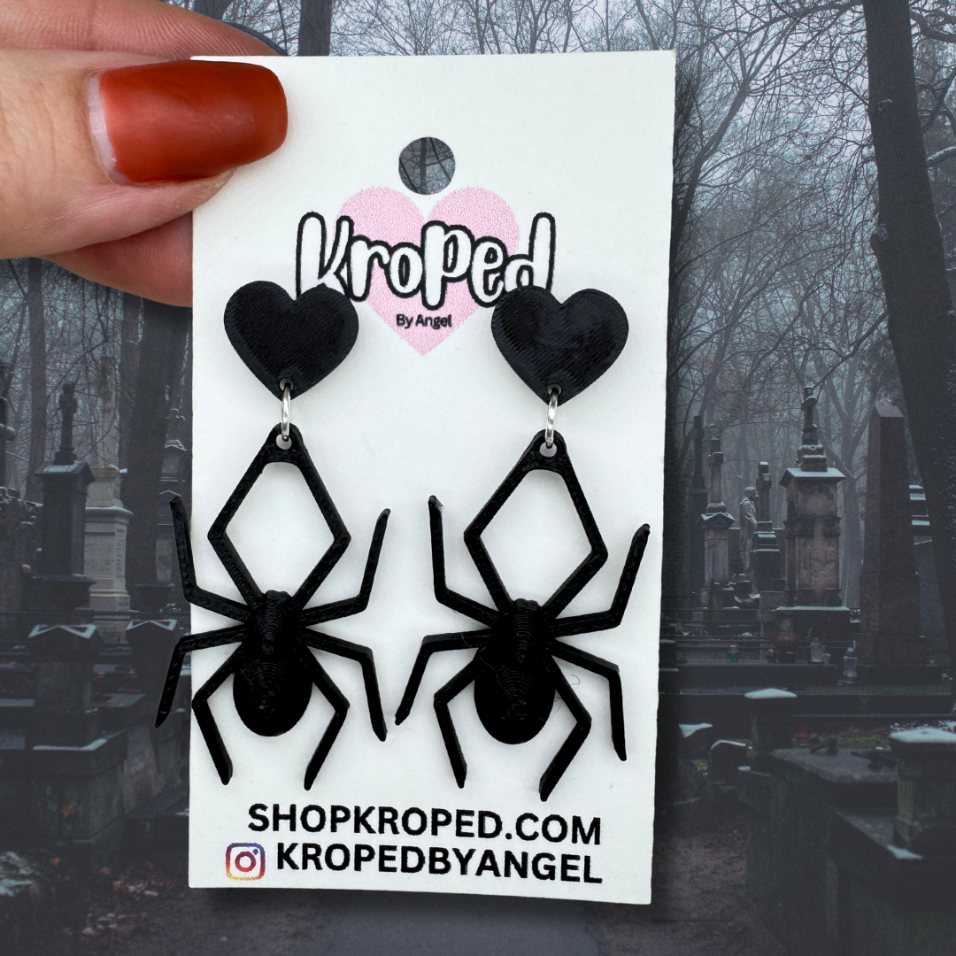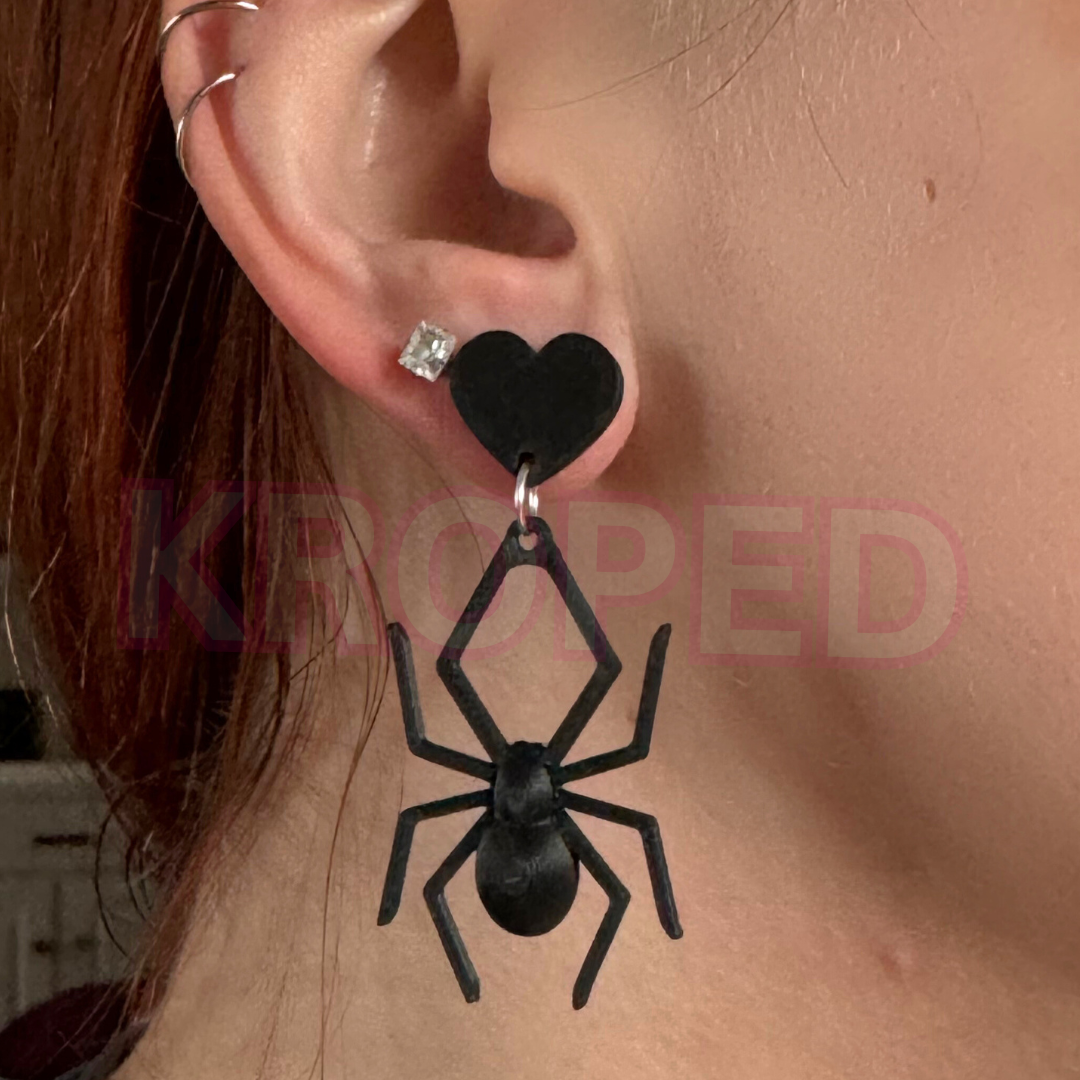 Creep it real with these 3D printed spider earrings! Designed with dangling black widow-inspired shapes, each spider hangs from a bold black heart stud and comes with sterling silver posts for comfort. The best part? These creepy-crawly cuties wiggle when you move, giving them extra life and flair. Perfect for Halloween, gothic vibes, or anyone who loves bold and spooky statement jewelry.
