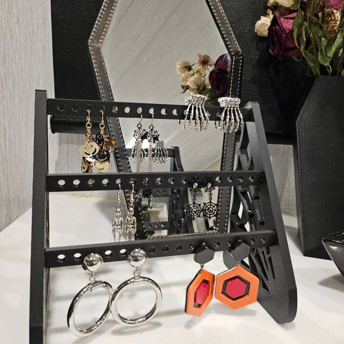 To ensure safe delivery, earring display stands comes unassembled with easy-to-follow directions. This allows for hassle-free shipping and ensures that your stand arrives in perfect condition. Once assembled, this stand is versatile and can be placed on a desk, tabletop, or shelf, adding a touch of elegance and spookiness to any space.