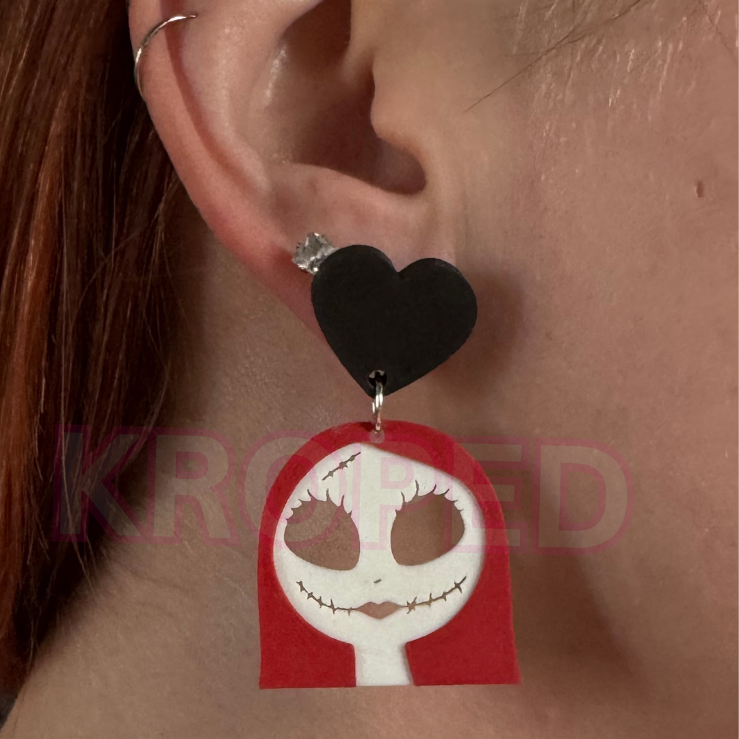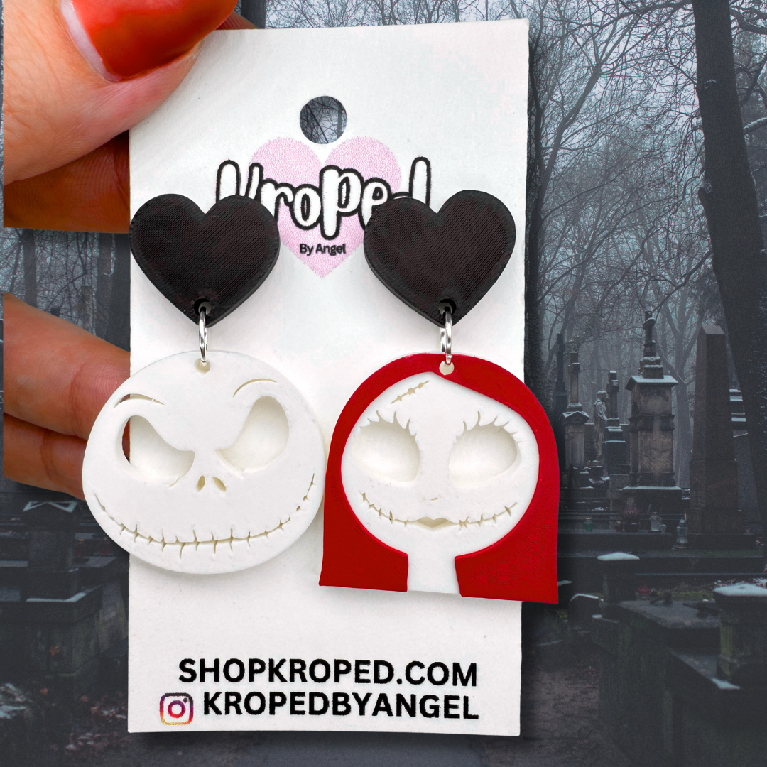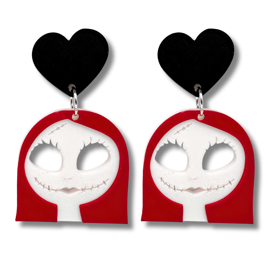 Bring a touch of hauntingly sweet charm to your look with these handmade 3D printed earrings. Each pair features two iconic faces — one with a stitched-up grin and the other with flowing red hair and stitched details — hanging from bold black hearts. Lightweight and eye-catching, these earrings are perfect for spooky season or year-round gothic style. Choose your favorite combo: both stitched grins, both red-haired girls, or a mix-and-match pair for the ultimate creepy-cute couple look.