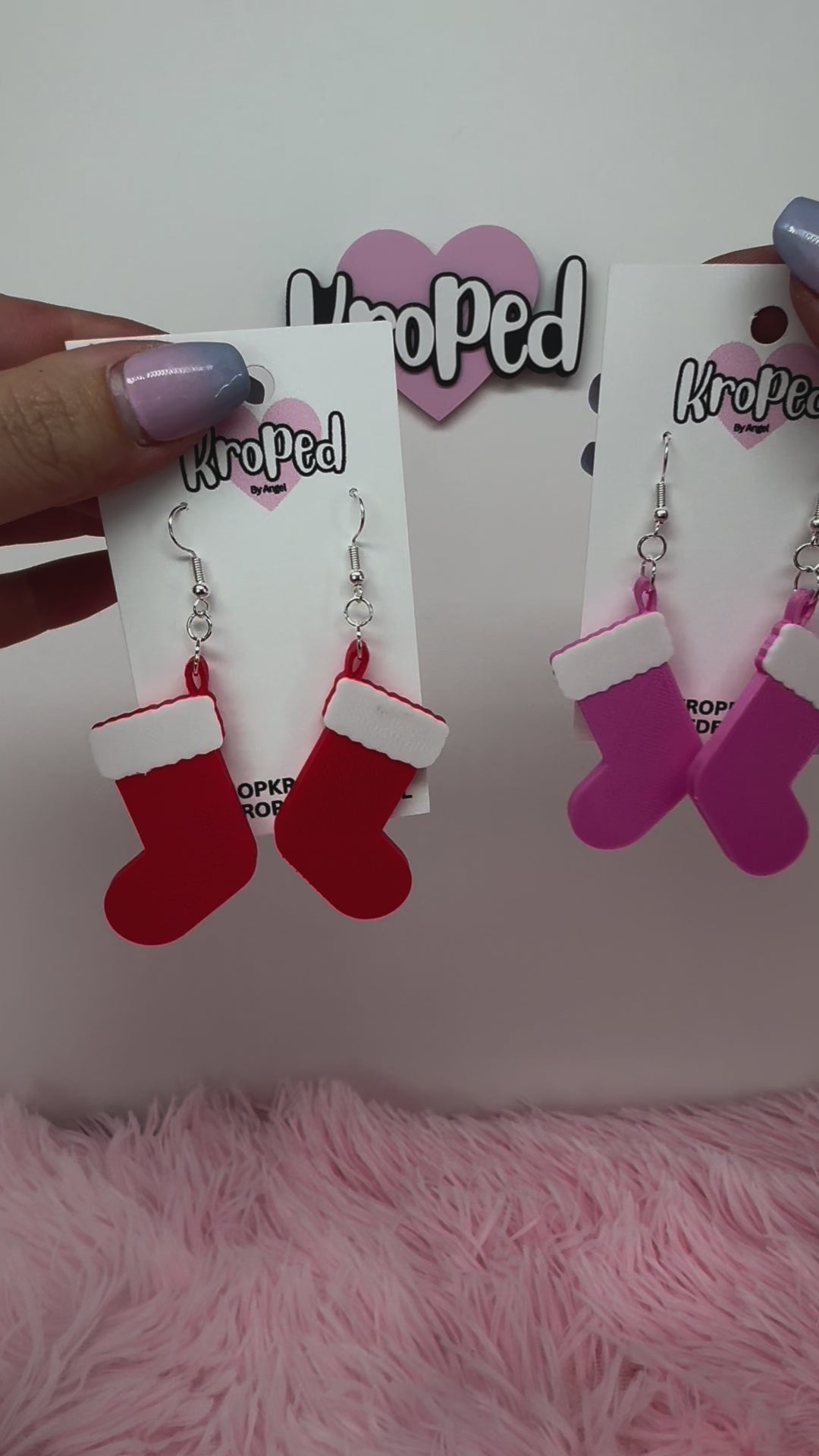 Christmas stockings earrings are lightweight, 3D-printed and available in a variety of colors, so you can pick any color to suit your style. Perfect for holiday parties or as a delightful gift, these earrings are a must-have for anyone looking to celebrate the season in style! Stockings are just over 2" tall.